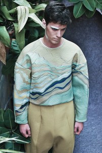 The pattern in this image from a fashion lifestyle blog shows how cool colors interact with each other. The color pallet creates a particular mood from the ow saturation and high contrast. The selection of how the colors are placed in this pattern bring attention to the very dark line in blue. The colors start much lighter on the outer parts, and darken very gradually as they come to the center (the blue line). The major contrast of the individual blue line to the rest of the shirt bring attention to the value as well. These colors all fall under blue, green and yellow hues, making the color scheme analogous, while still creating a major contrast. It is what helps create the gradual flow through the shirt as well. The asymmetry of the pattern is what helps the selective emphasis.