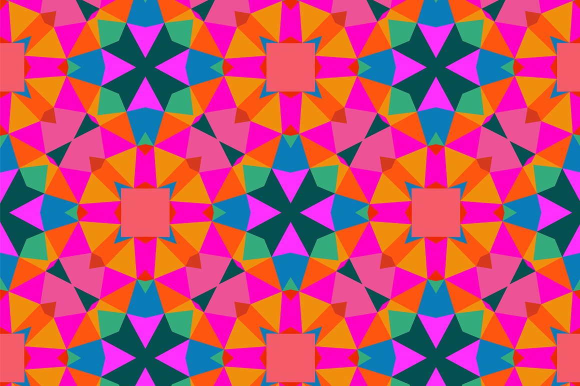 This pattern is a geometric pattern with lots of bright hues. I would describe this pattern as very exciting and bright. The dark blue stands out aginst the brighter oranges and pinks. The contrast between the dark versus bright brings my attention to the darker blue. The colors in the pattern becomes more saturated when the same hue overlap. The darker pink is like a more saturated version of the lighter pink and the darker orange is like a more saturated version of the lighter orange. The pink and orange is also a warm temperature color whereas the blue is a cool color. This makes the contrast even greater between the two colors. There is an analogous color interaction between the pink and the orange, as they are near each other on the color wheel. There is a complementary color interaction between the orange and the blue as they are on opposite sides of thw color wheel. This makes the colors stand out against each other even more. The high saturation of all the colors lends to more contrast between the two hues in the pattern.