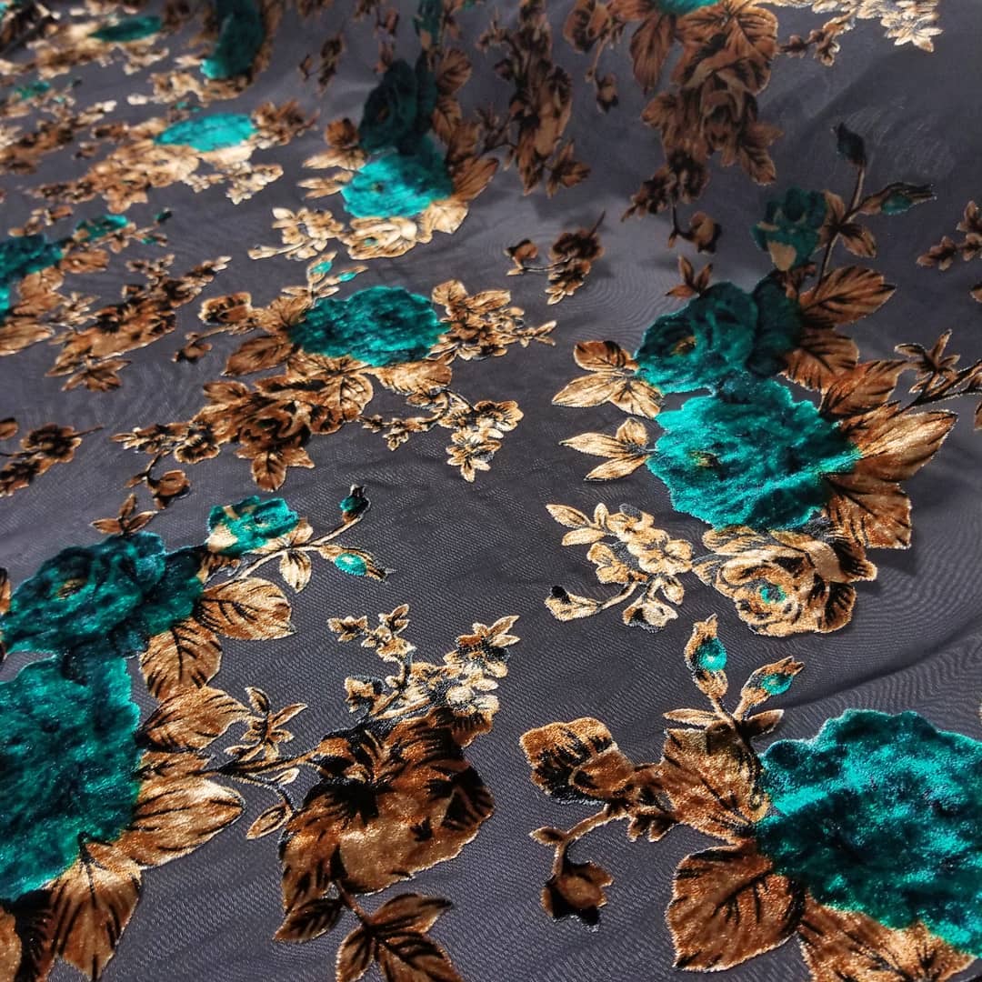In the photo to the left, Mood Fabrics is showcasing a popular velvet fabric they have for sale. The pattern of the fabric features a repeating flower pattern with slightly different orientations and sizes.