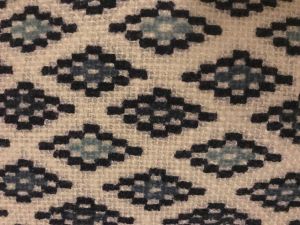 I think with this pattern that is apart of one of my pillows really shows how contrast can affect a pattern. The dark blues stand out against the white background, however, I found my eyes drawn to the lines of the white before really seeing any of the colors within the diamond patterns. The separation between the diamonds creates almost a dot-like aspect of the diamonds and the white then becomes the defining lines. The white is most definitely used to create a harsher definition for the diamonds because it creates those intense contrasts. The two different hues draw your eyes to the dots of the pattern while also creating a pattern within the larger pattern as well. I think it is very interesting how the hue and different colors interact. I know that white isn’t always ideal however I think it works very well here. The use of multiple hues of blues within the different diamonds most definitely draws my eyes in different directions I felt that in this small section it made me feel as though I was jumping from one to another even though it was structured. Due to the colors changing in the diamonds I ended up jumping all over and not having as much of a consistency between all of the diamonds in comparison to the strict white lines. The Analogous blues work really well with each other simply because if they were complimentary I feel as though the overall feel of the pattern would be highly overwhelming and my eyes wouldn’t know what to look at first. Thinking about what this would look like with complimentary colors there would have to be a low saturation to make it less loud and look more appealing to the viewer’s eye. Overall other than the white background I think that the pattern is successful.