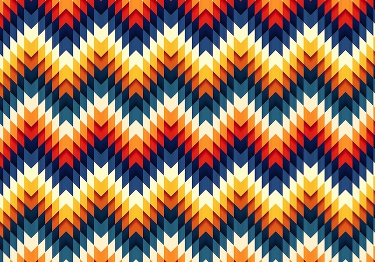 This picture is interesting because the colors and design make it seem like there are arrows going up, but depending on how you look at it, you can see arrows going down as well. The colors in this pattern image are either warm or cold. The reds in this image are bold, and help them stand out more than the blues. The blues in this image are darker and make it seem not as noticeable as the reds. This makes the blues be more diminished and not as important and disappear in the image. In the same sense, the blues in this image are used to intensify the reds and oranges. This image uses eleven different colors in it in a repeating pattern but from a distance you cannot tell how many colors there are. There are different temperatures of reds and blues in this image. The image uses a warmer red to have orange and also has a colder blue to create a dark blue. Half of the colors in this image are more saturated than the other half. They have a darker tone to them and separate them from the other colors. The colors are a mix of analogous and complementary. For example, Blue and orange are used and they are complementary but red and light blue are not complementary but rather analogous on the color wheel. There is no negative space in the image, unless you consider the white the negative space and all colors space filled in. It does not play a role in the overall image because the overall image is a repeating pattern and so all the colors work together.