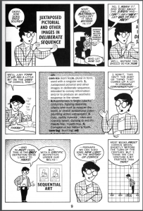 Reading Scott McCloud’s book understanding comics was not the first time I had to read a comic formatted this way or even the first time that I read a comic for class. So when I read through it, it was not really new territory for me, in terms of the style in which the book was made. This book made learning about comics themselves more interesting, partly because of the less words more pictures aspect that most textbooks don’t have. It was enjoyable read and the best part was not realizing that you were actually learning about the technicalities and the history of comics. The web comics on the other hand were a different experience. Eroyn Franklin’s web comics emitted a different vibe to them, while Scott McCloud made it seem like her was narrating you flipping the pages, the web comics seemed lacking in that sense. There was not intrigue on my part and it made reading them a bit less interesting, but still somewhat entertaining for a few minutes. I did not feel like I was getting much information out of them. In Scott McCloud’s comics he used different techniques of comic books throughout the book, for example as shown in the images, it goes from a giant picture in one page to back to multiple frames