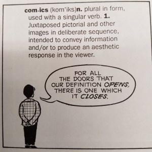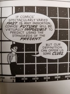 People make comics differently than how they did in the past. It is much more convenient to have files stored in the cloud or other access devises for the sake of not only portability but changeability. As well, the creation of this media changes too. Drawing in traditional pen and pencils leave some room for change to the actual creation, but in digitized media the entire piece can be changed at the press of a button. As well, the layout and consumption of digital media can differ. Creators do not have to worry about page length restrictions or even have to fit their art onto the traditional 8x11in size of paper. In return, putting comics online give less control to artists on how their art is viewed, either in sequence or in form. Reading in print vs. digital media for comics is different as well. The physical nature of turning a page can be soothing, but I would argue that for comics it is more disruptive than cathartic. The art/story is momentarily stopped in print. However, in digital media, the comic flows at the press of a button. Analyzing the difference between reading Scott McCloud’s “Understanding Comics” in print and his further web comics online is an interesting task. In print most of the pages are filled to capacity, the size of the comic boxes changes but the rectangular border box is very prevalent, and page flipping can lead to disruption of the story. In McCloud’s web comic the comic border is still used but noticeably missing, a webpage is not noticeably filled to capacity from left to right, and the use of scrolling makes for a more seamless enterprise.