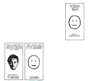 When reading Scott McCloud’s book Understanding Comics, it made me realize that comics is a artform, along with a type of literature, just as books are. There are many stereotypes regarding comics, such as they are children’s books or what I have fallen victim to believing, they cant convey any serious topics. After reading his book, I’ve realized that not only are the stereotypes about comics wrong, but that comics have the ability to convey information, or stories, that no other type of literature can. I hate reading, so when I was in middle school, and even some of high school, I would read graphic novels if I ever had to do the dreaded “book report”. However, what started as a way to make my book report “easier”, I realized that I actually really enjoyed reading them. Now my favorite book series of all time is a comic, Bone by Jeff Smith. The reason I believe this is because, graphic novels are often made using cartoons, and as Scott McCloud says in the book, “When you enter the world of the cartoon– you see yourself”. He is showing how the more distinctive or detailed a character is, the less people the character will look like. The way you can almost cast yourself into the character because of there simplicity, is the big reasons I enjoy comics/graphic novels so much.