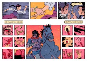 Jake Wyatt’s Necropolis takes the juxtaposition of multiple frames to paint a narrative to the next level. (Necropolis, Page 3 – Jake Wyatt)