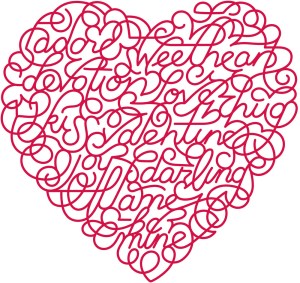 Secondly, Modularity is clearly a big part of this piece considering the narrowed topic of valentines day. Her heart is created entirely out of lines (mostly curly and organic) that blend together to create the form of a traditional Valentine. Hidden amongst the fluid lines are recognizable letters that grabs the viewers attention to try to solve the word puzzle. The words that are written inside the heart all fit into the category of valentines. Without modularity, it would be hard to make certain decisions that were made throughout this piece such as the type of font to use.