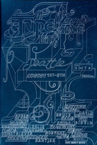 I chose this design because to me it looks like what a blueprint would look like with the blue background and the white, chalk like, lines creating the design. Also the use of three dimensions and words not only going left to right, but forward and back and up and down makes it interesting to look at and keeps the eye moving around the image. This design also spoke to me because it was about an event that was in Seattle and that is where I am from. In this design you can see how Marian Bantjes used formstorming to go beyond what someone would normally create for an event. Bantjes used formstorming to help create a more in-depth image that is beyond the normal 2D image that is created for events. This image took a long time to create and could of started on a piece of paper before going to the computer to create the final image. In this design you can see how there are many layers and dimensions to the design. The way Marian Bantjes created this also has the feeling of modularity in the sense that the design looks like pieces of a puzzle that are put together to create a bigger design. Each word is designed as a block and that block is added to the overall design that creates this mysterious structure. This creates individual modules that each have a story on why they are on the image.