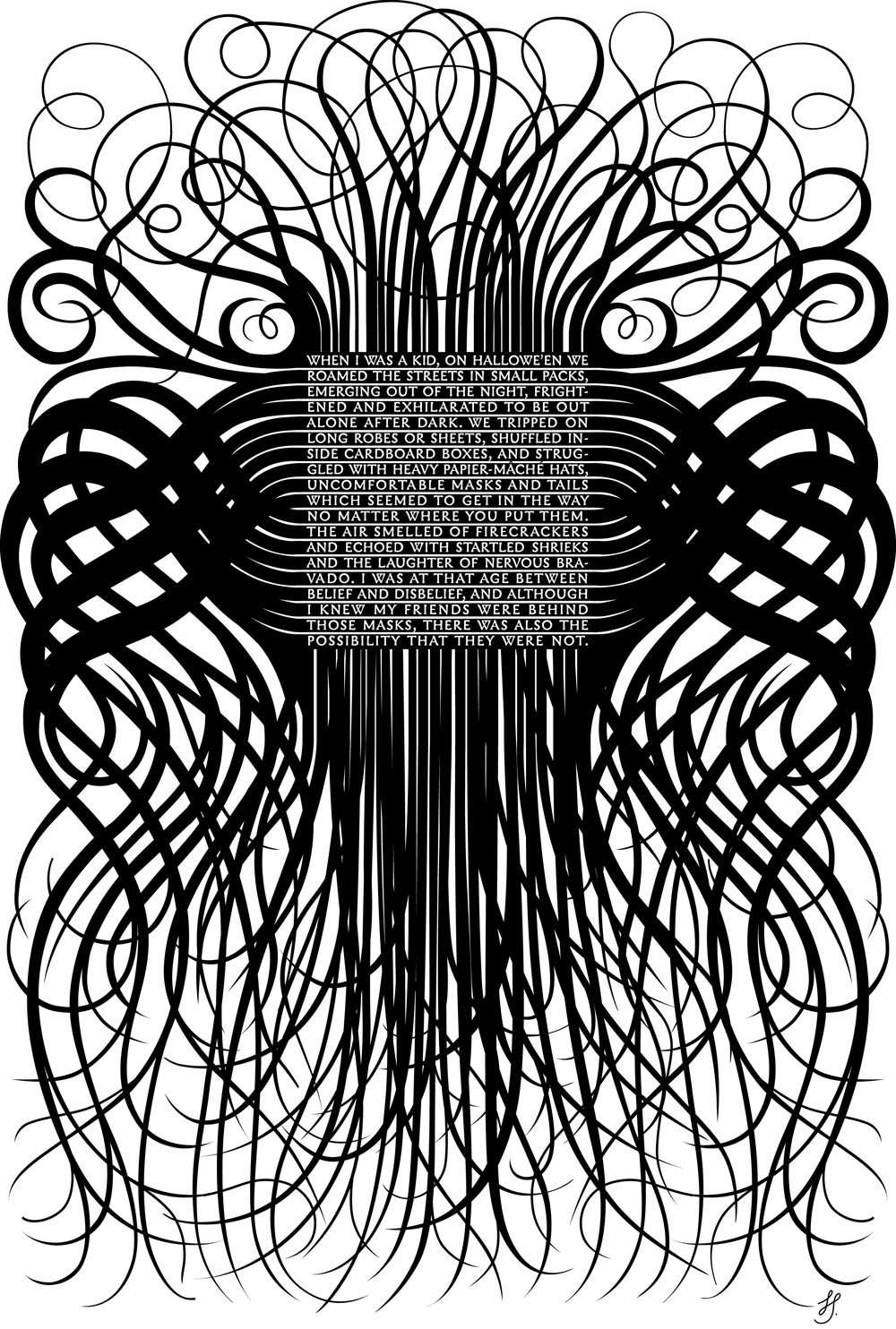 I chose Bantjes Halloween ’05 design it stood out to me in particular amongst her other designs. Many of which consist of bright colors and abstract uses of other familiar objects. However, this design the text is easier to read in comparison to the puzzling attributes of her newer works. Halloween ’05 most definitely has an eerie vibe about it and evokes an almost haunting aesthetic on the viewer. Overall I think that this design looks unique and like tentacles rather than light and normal object.