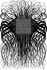 Rather than her other designs which often represent puzzling and confusing pieces with lighter colors this design is unique in its modularity. Other than the words themselves, I think that this designs overall modularity is the black organic lines. Something like tentacles or overgrowth streaming out from the type. The type font in itself similar to the overgrowth creates an ancient or old feeling to the design itself. As a whole, however, there seems to be less focus on the Formstorming of creating a puzzle to the design. I don’t see anything other than the intertwining lines and then the type. Banjes in her newer works utilizes Formstorming to create that challenge or puzzling attributes to involve the viewer in figuring out what is going on within the design.