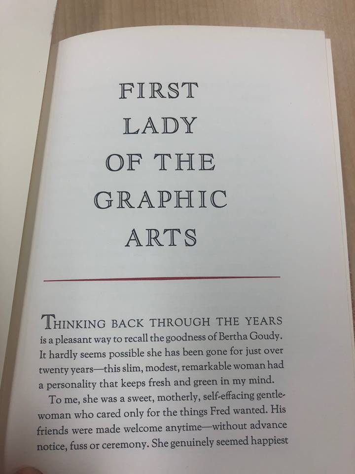 I thought all the different type faces we looked at in the library were very interesting. One that I specifically picked out was from a text from Bertha S. Goudy: First Lady of Printing. The title is a decorative serif font that really stood out to me. It has a hollow center, so where the lines would be thick usually, it is hollowed out. I think it gives it a very formal and almost regal look. This title is paired with another serif font in the main text that is less decorative and better suited for a main text. This typeface is less decorative than the title, but still has elegant looking flairs and extra accent pieces. The title text with the hollowed out pieces really stood out to me as something I might use as inspiration for my own type design and poster for project three. I liked that it uses the negative space in a way that isn’t distracting and makes it look very fancy and elegant. It reminds me of something from Medieval times which could be something I can incorporate into my decision of what text to use for my inspiration for project three. I think the way the text looks also goes hand in hand with what the text is actually saying. The words “First Lady” makes me think of someone very important and regal, which is matched in the type. If the actual words were different, the font makes it have a different meaning. I think that is also important to remember for project three because how I chose to make the font appear should directly correlate to what the words are saying.