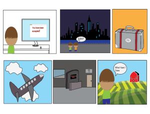 When looking at the comic I’ve created, I would say that it fits his definition of what a comic is very well. That being “juxtaposed pictorial and other images in deliberate sequence”. My comic fits all of these elements. First, all of my pictures are juxtaposed because they are all placed side to side. They are also all pictorial images created from scratch that are placed in a deliberate sequence so that they flow from left to right to tell a story. Like Scott McCloud’s print based book, I have decided to go with a print based comic as well. Comics are art as much as they are literature, and in my opinion, that side of my comic, and all comics for that matter, shine through more when there is a physical copy of it in your hand. Also, text has to be configured a lot differently depending on weather it is printed, or digital. I thought that the way the text is laid out in my comic, it was better to go with print.