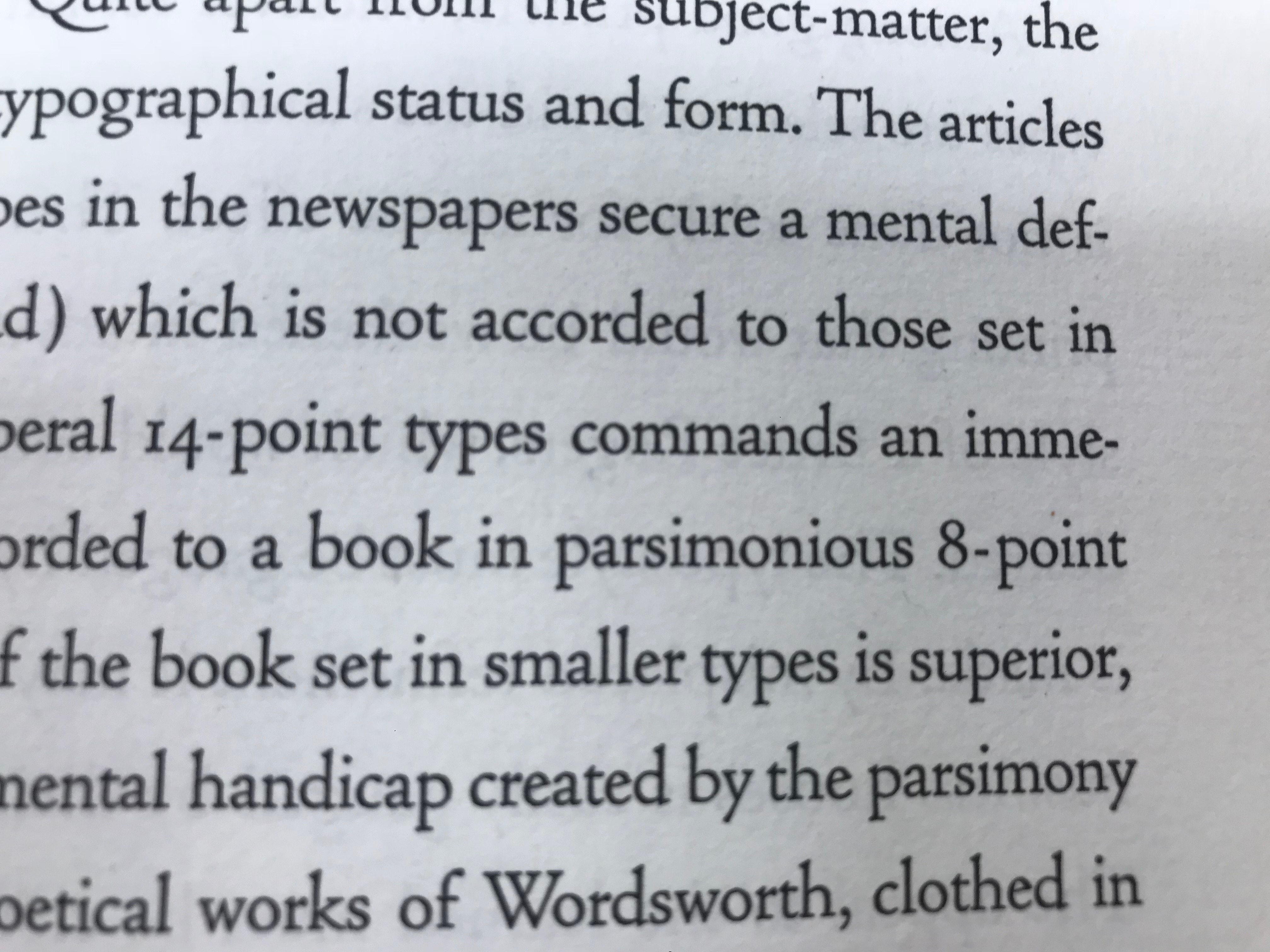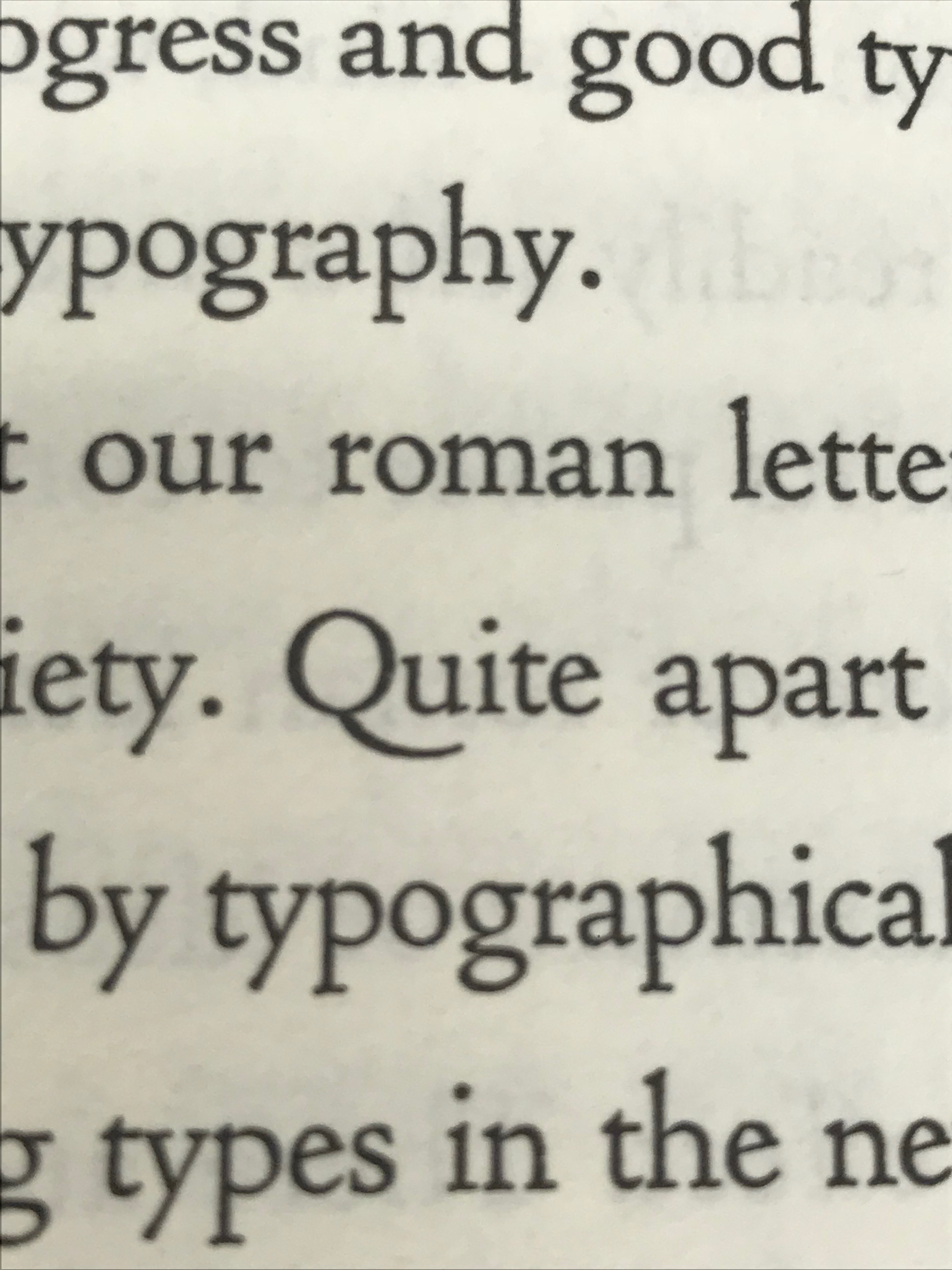 The type I chose to analyze from the MASC is from a book called “The Psychology of Printing Types”. It is a serif font that most people would just assume is Times New Roman. However, after learning more about typefaces I can see that there is a structure to typefaces and there is a lot that makes this type unique. The first thing that caught my eye was the capital ‘Q’ and letter ‘u’ at the start of one of the sentences. The finial of the Q stretches under and over to the end of the ‘u’, which is something unique about this type. Since the letters ‘Q’ and ‘U’ typically go together, I think this was a strategic decision made by the creator if they were working with moveable type, because it would mean only using one letter block to print two letters. Another aspect of this font that differentiates it is that the type contains ligatures between some of its letters. This is not uncommon amongst serif fonts but when discussing fonts in general, these liga