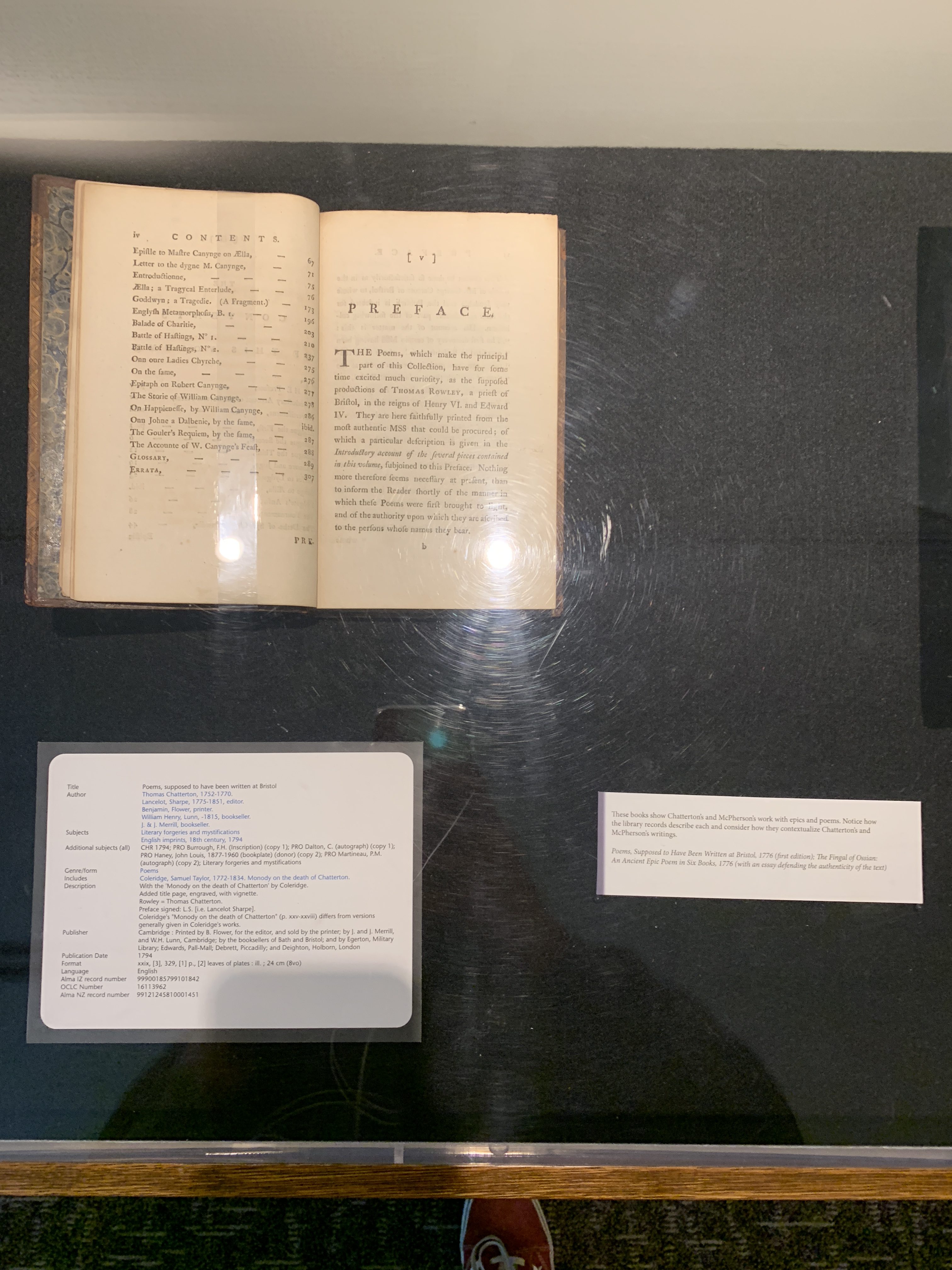 While I wasn’t present in class the day we went to go look at the manuscripts I made sure I went to the the exhibit that they have set up right now and checked out the other font. The one I found the most interesting and that I felt related to the reading we did on typography was Poems supposed to have been written at Bristol by Thomas Chatterton. I was analyzing the text and I found that the first word you see “P R E F A C E” when looking at the word you can clearly see that it contains stems, bowls, cap height, base height, and x height along with many of the other parts of anatomy used in typography. This font is a serif font. We can see this by the way the ends of the words have a little hangover on each letter. Another thing I noticed that was mentioned in the reading is the size difference. It is common for the firs paragraph of a word to start with a bigger capital letter than the rest of the words. You can see this when the paragraph starts with the word “The”.