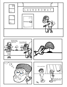 My comic was intended for print on an 8.5 x 11 inch page. After reading Eroyn Franklin’s digital comics and Scott McCloud’s print comic, I realized I enjoyed reading comics in a printed form much better. I don’t know whether it was the satisfaction of turning each page and looking forward to what’s on the next or having the physical copy of a text in my hands that gave me a sensation of liking print more than digital comics. Creating this comic was somewhat challenging for me because I found myself wanting to draw every movement of the main character, Jim. However, in Scott McCloud’s book Understanding Comics, he talks about the idea of closure and how there is a power to leaving the invisible and in-between frames events up for interpretation by the reader. In the third page of my comic, I attempted to have a more unique transition from frames by creating a though bubble that turned into its own frame. In Understand Comics, McCloud talks about the six layers of comics in reference to an apple. In my comic, I made the creators decision to have a strong “seed”, as McCloud referenced, or idea/story of the comic. My comic focuses on Jim reminiscing about the love of his life, Maria, by trying on hats that he’s worn throughout his life that flash him back to important moments in his life. For example, on the first page of my comic, which is depicted above, Jim tries on a striped hat that represents his youth and when he first met the beautiful Maria. Since this was my first time using Illustrator, I steered away from having intricate details and vibrant colors, focusing more on the plot and I hope my viewers understand and enjoy that aspect of the comic. I used many tools in Illustrator such as the brush tool to create all of my characters, pen tool 1 to create the frames and straight lines in my comic, the layers tool to separate artboards and figures I wanted to separate, the text tool to create all the speech, etc. Overall, I believe my comic utilized the conventions from Scott McCloud’s Understanding Comicsin order to create a printed comic.