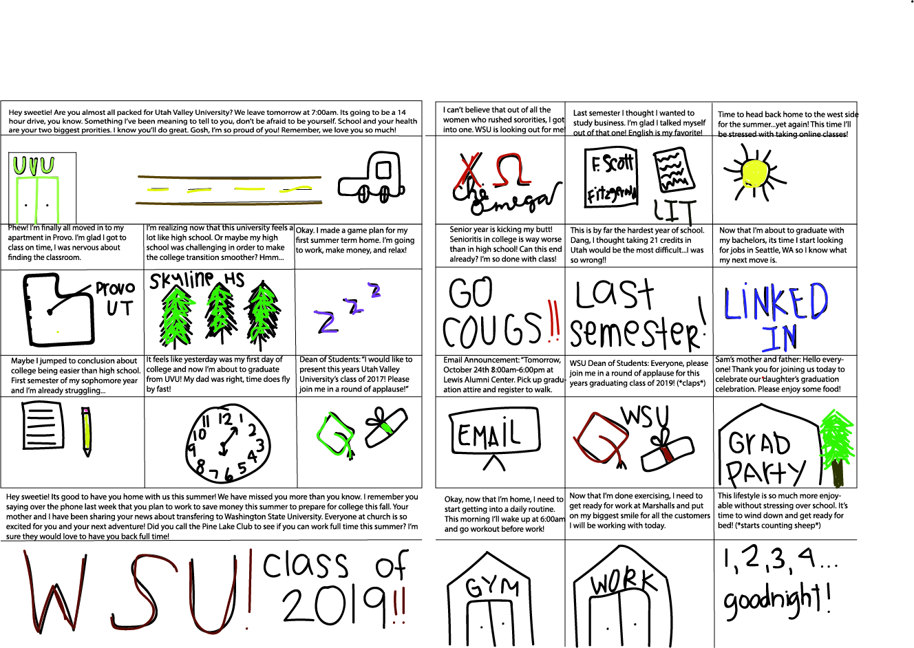 McCloud’s definition of comics is “juxtaposed pictorial and other images in deliberate sequence” (9). In my comic, “The Ride to Success,” I chose to use words as the structure in order to tell the story in a chronological order. The intended humor in this comic is the fact that although “The Ride to Success” is about a girl who is a spitting image of the author and shares her story of attending college, the author has no idea how to draw. The decision to find strength in words rather than pictures came from chapter six in Understanding Comics by Scott McCloud. McCloud discusses how changing the balance of words and pictures can allow readers to interpret an author’s comic differently. McCloud wrote, “on the other hand, if words lock in the ‘meaning’ of a sequence, then the pictures can really take it off” (159). To ensure reader comprehension of my comic, I focused on the