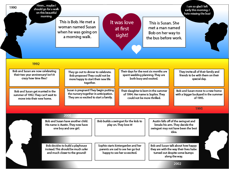 I originally thought that I wanted my comic to be viewed on the web; however, throughout the course of completing this project I have actually changed my mind. I want my comic to be something tangible that people can actually hold in their hands. I think that physically holding something is a really important part of interpreting it. I also really hope that people are able to interpret my comic somewhat easily. The progression of events is fairly standard for a married couple and this is why the characters are portrayed as silhouettes. They could be anyone. This allows readers to read the story while also envisioning their own characters. I also used color to not only signify the passing of time, but also the season in which the sets of events occurred. The color gradients signify the progression of the timeline. I hope that my viewers recognize this as well.