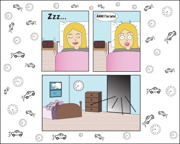 technique in my first two slides. All of my slides lead up to the girl in my comic running out the door because she is late. This supports McCloud’s definition of comics and how my slides are deliberately in sequence and are juxtaposed pictorials. Another concept I used in my comic was the “subject-to-subject” technique (70). On my last slide, I wanted to have a different view point of the girl’s bedroom but I didn’t want to show he actually running out the door. I wanted the viewer to interpret the comic without explicitly being shown what happened. In McCloud’s book, he played around with different and interesting boarders. I decided to make a boarder around my main slides and add clocks and cars all around. I thought this made my comic more interesting and different. I tried to keep the text and speech bubbles to a minimum. I wanted the pictorials to speak for themselves. However, I think the text I included made the comic more relatable. Originally, I wanted to have my comic be printed. However, when I think about the future of comic I believe that it will be online. Online comics are relatively a new thing. However, most everything is becoming digitalized. I think this would make the comic more accessible to the public, which is why I chose to not print my comic. This persuaded me to make my comic be read online. I want the viewer to view my comic as a story. I chose this topic because waking up late is often a common thing that happens to me.