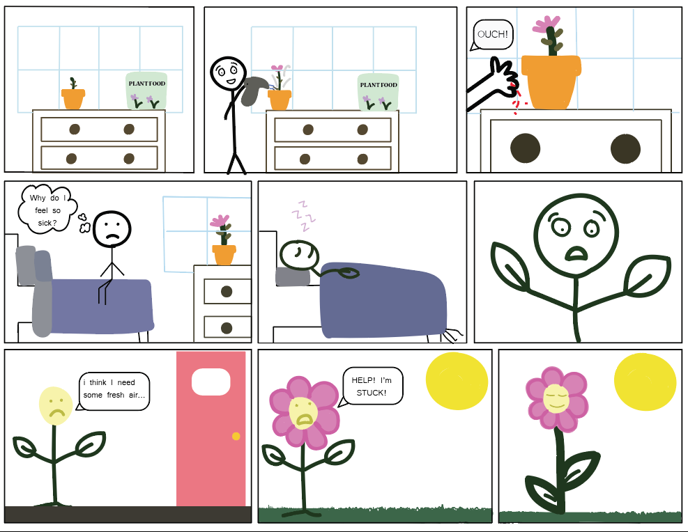 My blog, “A Boy and His Flower”, was inspired by Spiderman. I took the the concept of Spiderman and gave it a floral spin. Similarly in Spiderman, he is bit by a spider and turns in to Spiderman, but my character gets pricked by the thorns and then turns in to a flower. This relates to Scott McCloud’s book because I feel like I had a lot of good use of color, I kept it very simple yet still got my point across. The comic itself is very easy to follow, and with little dialogue it’s clear what’s going on. It fits the idea of, “juxtaposed pictorial and other images in deliberate sequence”, because my comic flows very nicely I think. In each frame, from the beginning, it’s obvious that everything that soon happens after is a reaction from the previous frame just before. I liked my usage of the different widths of the lines because it shows that it’s not all the same. My character when he is a human is used with small lines, but when he turns in to a flower, he becomes thicker like a stem and grows leaves and roots. I also had good use of color because when he is a human, he is used only in black so it really shows the difference when he turns green and his face turns yellow with pink petals. I wanted this comic to be very simple and not over the top with designs or anything like that because I feel like when there is a lot going on in a comic, it’s hard to really understand what’s going on because there is so much to look at; which can get confusing, too. I believe the environment for my blog could be anywhere, it’s a goofy comic with no underlying meaning so, it could be read anywhere at any time. I hope my readers see it and just smile, it’s a quirky little comic which I truthfully enjoyed creating.