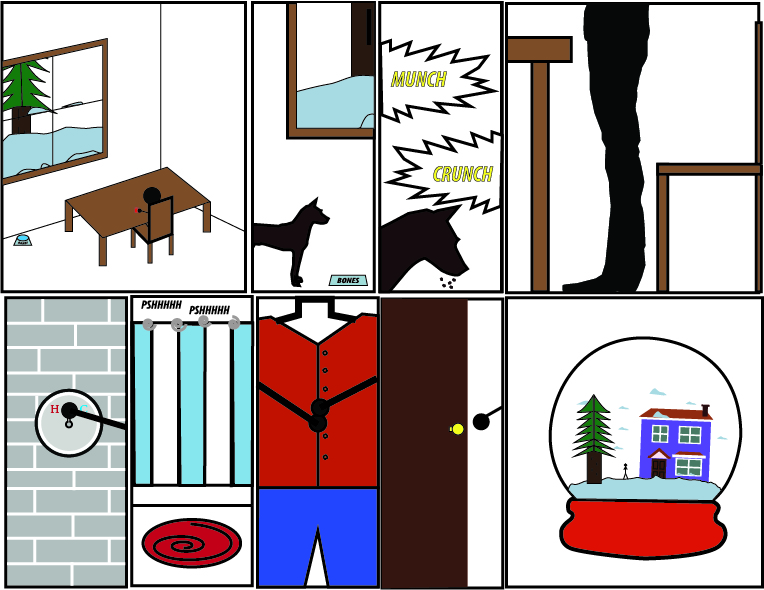 The use of closure had a major impact on various parts of my comic. Closure allows the audience to connect what is occurring between the frames. For example, because I used an image of a person sitting in a chair in the first frame, the audience can understand that the fourth frame is of a person getting up out of a chair instead of a miscellaneous image of a person standing next to a chair. To connect the last image to the rest of the story, readers of my comic had to use closure to understand that a person is getting ready for their day and stepping outside. I also utilized different frame sizes to emphasize certain aspects of my comic. In my action sequence I used smaller frames to show that they are connected and in the first and last frames of my comic I used larger frames because they are the images with the most detail. I also made sure to pay attention to detail so the readers can better understand the story. The window in the first image matches the view from the window in the last frame. Another time I payed close attention to detail was when I presented the dog bowl and name in the first frame to carry over into the second frame.