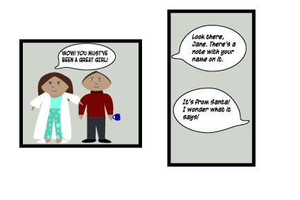 My comic project fits Scott McCloud’s definition as I have used a mixture of frames with pictures, frames with pictures and text, and a frame with only text. All of my frames are put in a sequence where the reader’s eyes flow from the first frame all the way down to the final frame. The specific concepts from McCloud’s book that influenced my decisions when designing my comic were making frames, no matter what size, that would tell my story smoothly. Sometimes comics can be tough to follow if there are frames that seem to ‘jump’ from one section to the other, so I wanted to create little frames that would pull my story together and make it flow. Another concept I tried to incorporate is McCloud’s description on the importance of sequence. I decided to move around some frames to make the story flow better because if there are frames that do not fit well together then it also makes it difficult to read. Thirdly, I wanted to incorporate including detail when necessary and keeping designs simple. I added details on the outfits to make it more realistic and Christmas decorations to bring in holiday, cheerful spirit, but kept the supermarket and alarm clock, for example, as more simple designs.