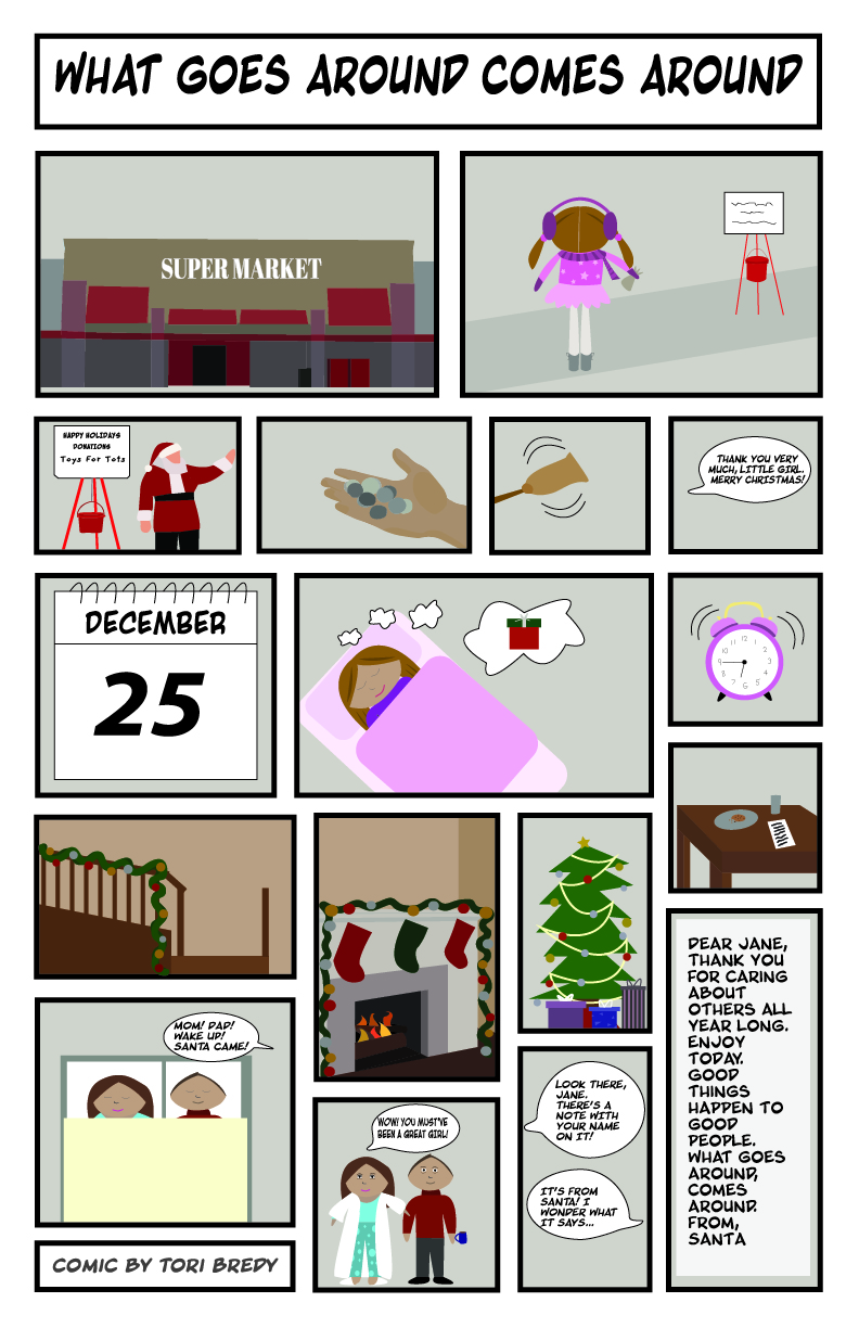 I hope my readers will read my comic and have a warm, fuzzy feeling people get when they do the right thing and are rewarded for it. The title, “What Goes Around Comes Around,” is a saying I try to live by every day and wanted to demonstrate this saying in an artistic form.