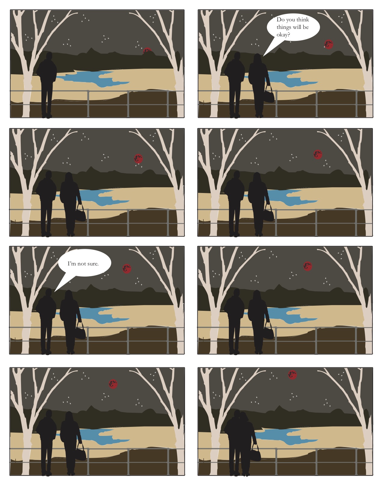When I set out to make Everything’s Going to Be Okay I wanted to do something a little off kilter. One of my favorite tools in comics is a still image repeated across a page with character dialogue but no motion. McCloud said “By stripping down an image to its essential “meaning”, an artist can amplify that meaning in a way that realistic art can’t”. I wanted to communicate cold, quiet, and a long awkward silence where the characters search for what to say.