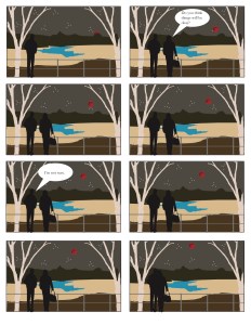 Communicating something like that without many words can be difficult. I drew inspiration from McCloud’s quote, trying to distill the image to it’s basic parts. I was hoping this starkness would communicate cold to the viewer. The leafless trees and the distant mountains also served to further this goal I also wanted to focus on using the image to communicate instead of with speech bubbles. Minimizing the amount of speech helps cultivate the quiet I was going for.