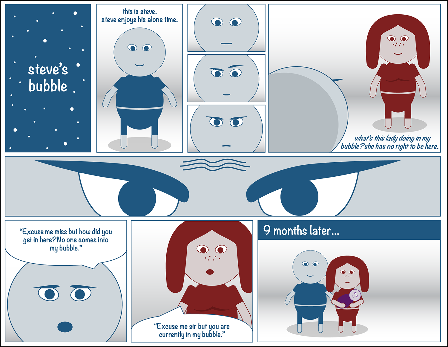 The short story I came up with for this project fits into McCloud’s definition of what makes up a comic. At the most basic level, my story follows a character through a sequence of frames to illustrate a timeline of events that occur. The main protagonist Steve is content living in a space that he’s knows and claims as his own. He spots another person entering his bubble of space and becomes irritated at the fact that they would wander into his area so aimlessly. After confronting his intruder, she rebuttals to Steve in a mirrored reaction. Steve realizes he is not entitled to that specific space at all. In fact, he realizes she must feel the same way he does and the two bond over their shared ideals. I utilized the concept of expressing emotion through the use of facial expressions in my comic. I want the reader to understand the frustration Steve was experiencing and how his thoughts changed through the sequence of frames.