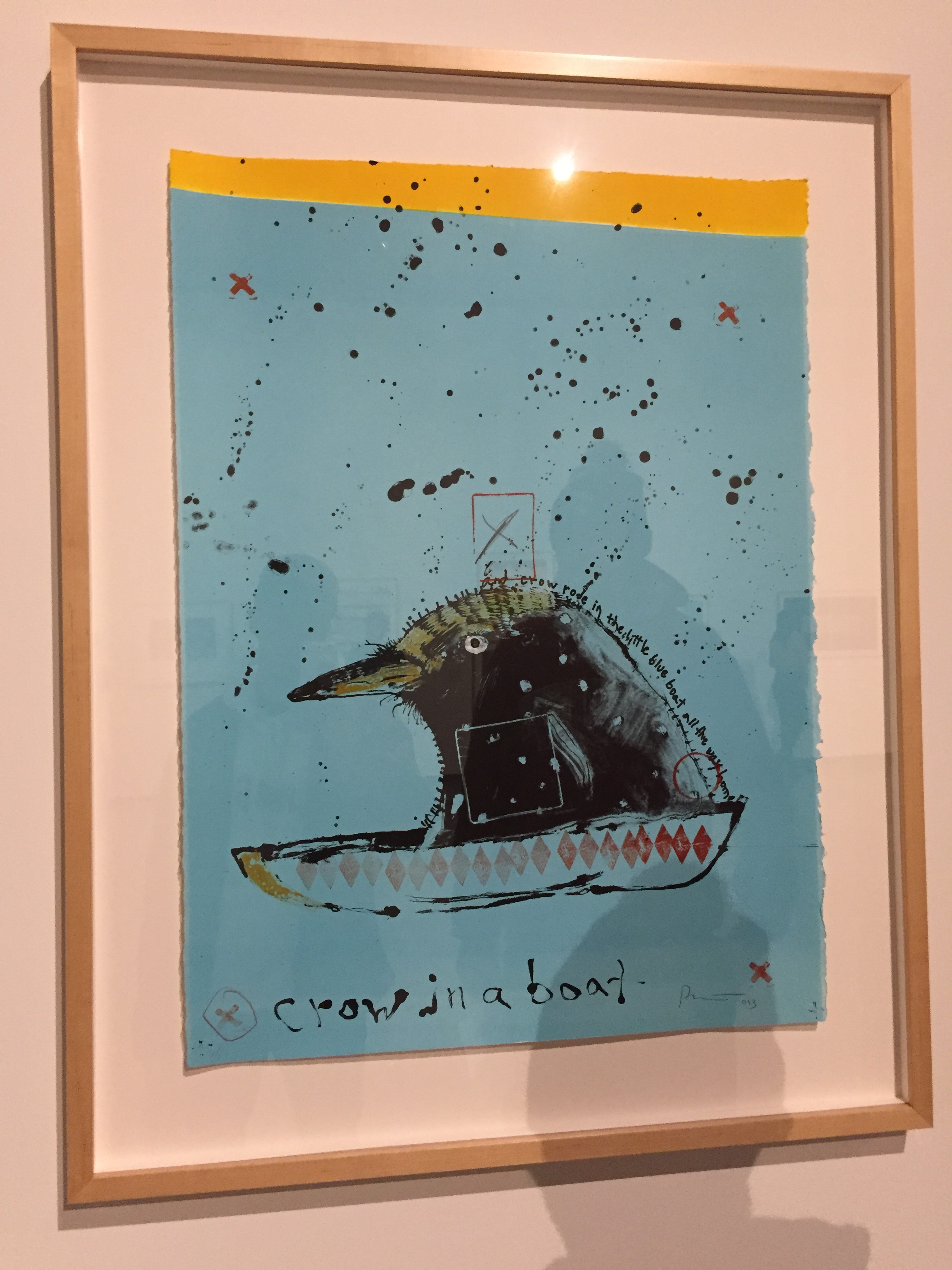 For my analysis from the Art Museum visit, I chosen the painting titled “Crow in a Boat” by Rick Bartow. This painting originally caught my eye with the bright colors and heavy contrast that is used. The heavy black from the head of the crow against the light blue background creates a very appealing contrast that I really enjoy, along with the slight strip of yellow that travels across the top of the painting. Another aspect of this painting which really stood out to me was the text that is placed in the lower left hand corner of the painting. In most works, the artist does not usually include the title in the same frame as the painting or creation. It is generally placed on a placard that sits in the same vicinity as the painting. I found this to be very interesting because it adds a sense of completeness to the painting. The text in itself becomes a separate entity within the painting, which allows one to draw meaning from just the text alone.