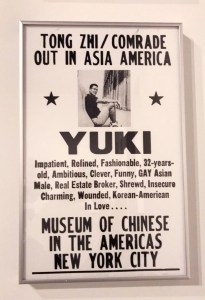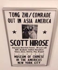 In the Washington State University art museum, these posters caught my eye. I think that they have a powerful message, and are very thought-provoking. The series of posters were created by Ken Chu to highlight and normalize the gay Asian American community in the US. His work Tong Zhi/Comrade: Out of Asia America highlights the lack of acceptance in Asian American communities in contrast with the US. The posters use an important and newslike text to explain the hobbies, interests, and family lives as well as their sexual orientation.