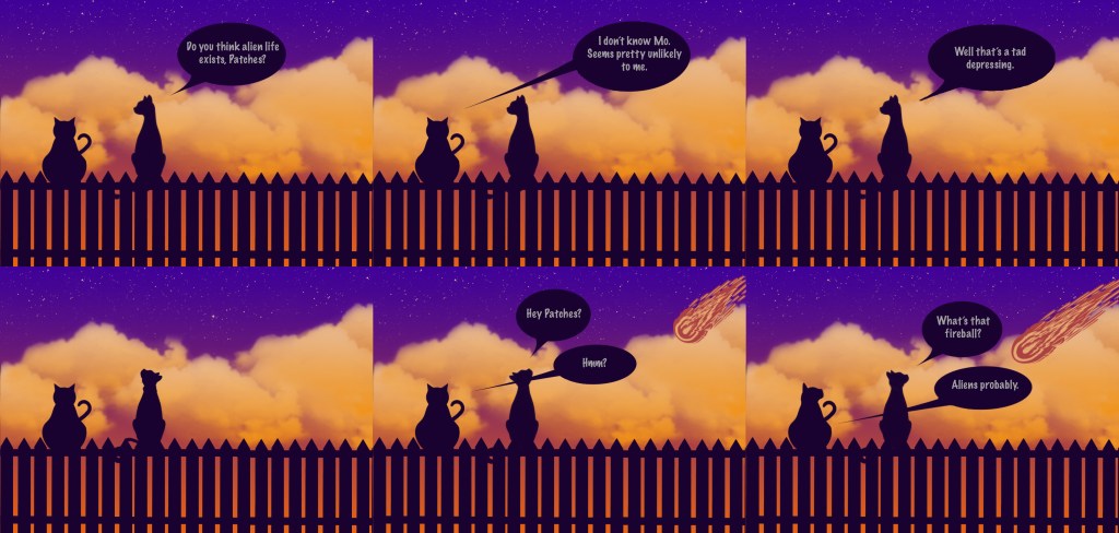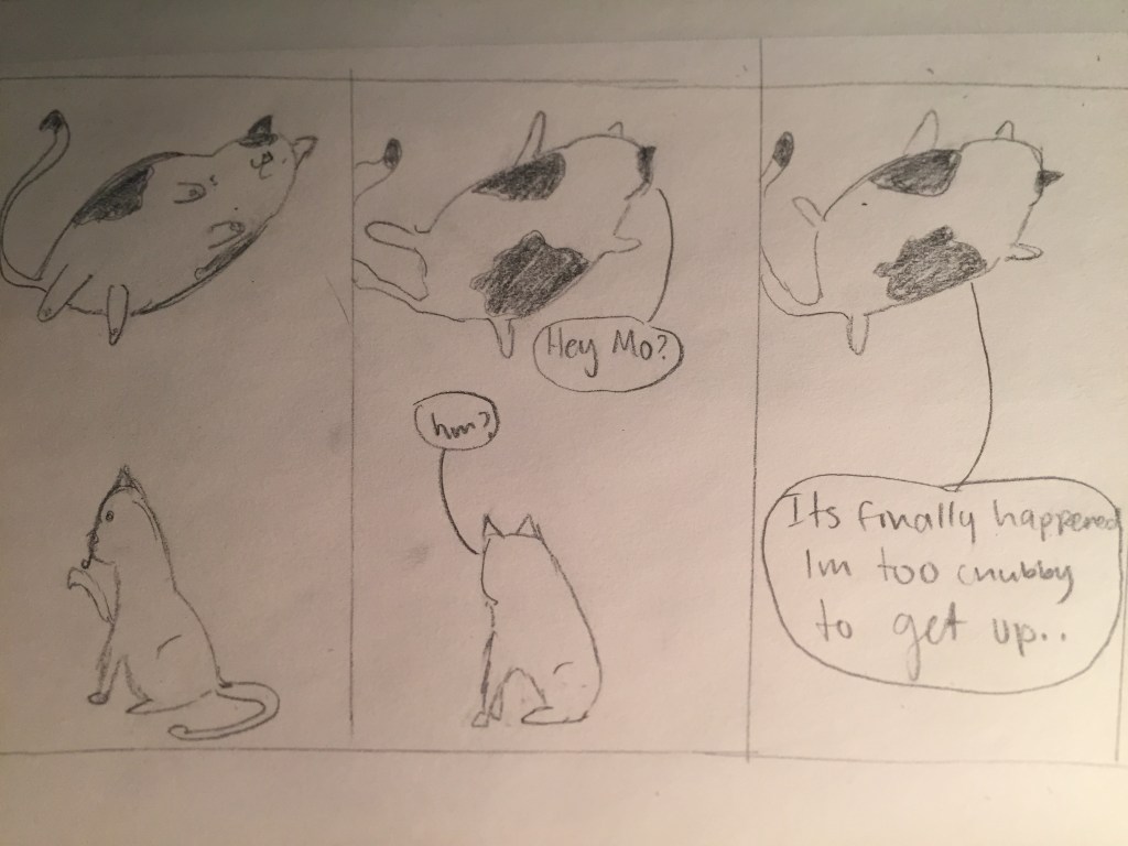 When making my hand drawn comic I had no idea what type of story or message I wanted to tell. I ended up doodling cats and decided to create a dynamic between two cats that live in the same house. They are roughly based off of my own cats, one of them is very overweight which is where I got the idea from. In my hand drawn comic I started out very simple with little dialogue or story, but in my second digital comic I decided to give them much more of a personality and dynamic between the two. I used the same characters both times because I felt that with hand drawn media I couldn’t really be as creative as I wanted to be. Im not the best at drawing so it was really hard for me to make them appear the way I wanted them to and I ended up making the comic as simple as I could because of this. In the digital comic I let myself run with the idea because graphic design such as this is something I really enjoy doing and have a bit more experience with than hand drawn. I used photoshop. For me it was much easier to tell the story that I wanted to tell, and make the characters look the way I wanted them to (even though they’re silhouettes). The only thing from hand drawn that I would say I prefer is the text bubbles. Handwriting for me has much more personality than typed text does, and I feel like the words fit into the comic more, especially with how dark my digital comic was. As far as paper as opposed to a screen I still prefer to read off of paper, it seems much more interactive and visually appealing.