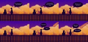 the idea from. In my hand drawn comic I started out very simple with little dialogue or story, but in my second digital comic I decided to give them much more of a personality and dynamic between the two. I used the same characters both times because I felt that with hand drawn media I couldn’t really be as creative as I wanted to be. Im not the best at drawing so it was really hard for me to make them appear the way I wanted them to and I ended up making the comic as simple as I could because of this. In the digital comic I let myself run with the idea because graphic design such as this is something I really enjoy doing and have a bit more experience with than hand drawn. I used photoshop. For me it was much easier to tell the story that I wanted to tell, and make the characters look the way I wanted them to (even though they’re silhouettes). The only thing from hand drawn that I would say I prefer is the text bubbles. Handwriting for me has much more personality than typed text does, and I feel like the words fit into the comic more, especially with how dark my digital comic was. As far as paper as opposed to a screen I still prefer to read off of paper, it seems much more interactive and visually appealing.