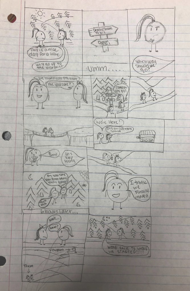 From reading Scott McClouds, “Understanding Comics”, it helped me realize that comics are not just a story like a book. Understanding the meaning of what a comic is made me think more creatively, visually and also have a better understanding of juxtaposition in comics and making sure that the order makes sense.