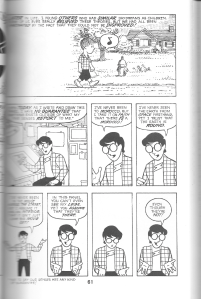 The last element is the element of Texture. This can be clearly seen in the largest panel on the page, being able to see depth, the use of the grass, and the texture of the house in the background. It give the reader an easier time to make sense of the illustration so that the illustration can give a sense of visual or physical texture as defined by John Lovett. In this case, Visual Texture is used to give the illusion of a physical texture. While this may not be the Mona Lisa painting, the comic still gives a sense of visual texture and it really makes the visual more believable and lifelike.