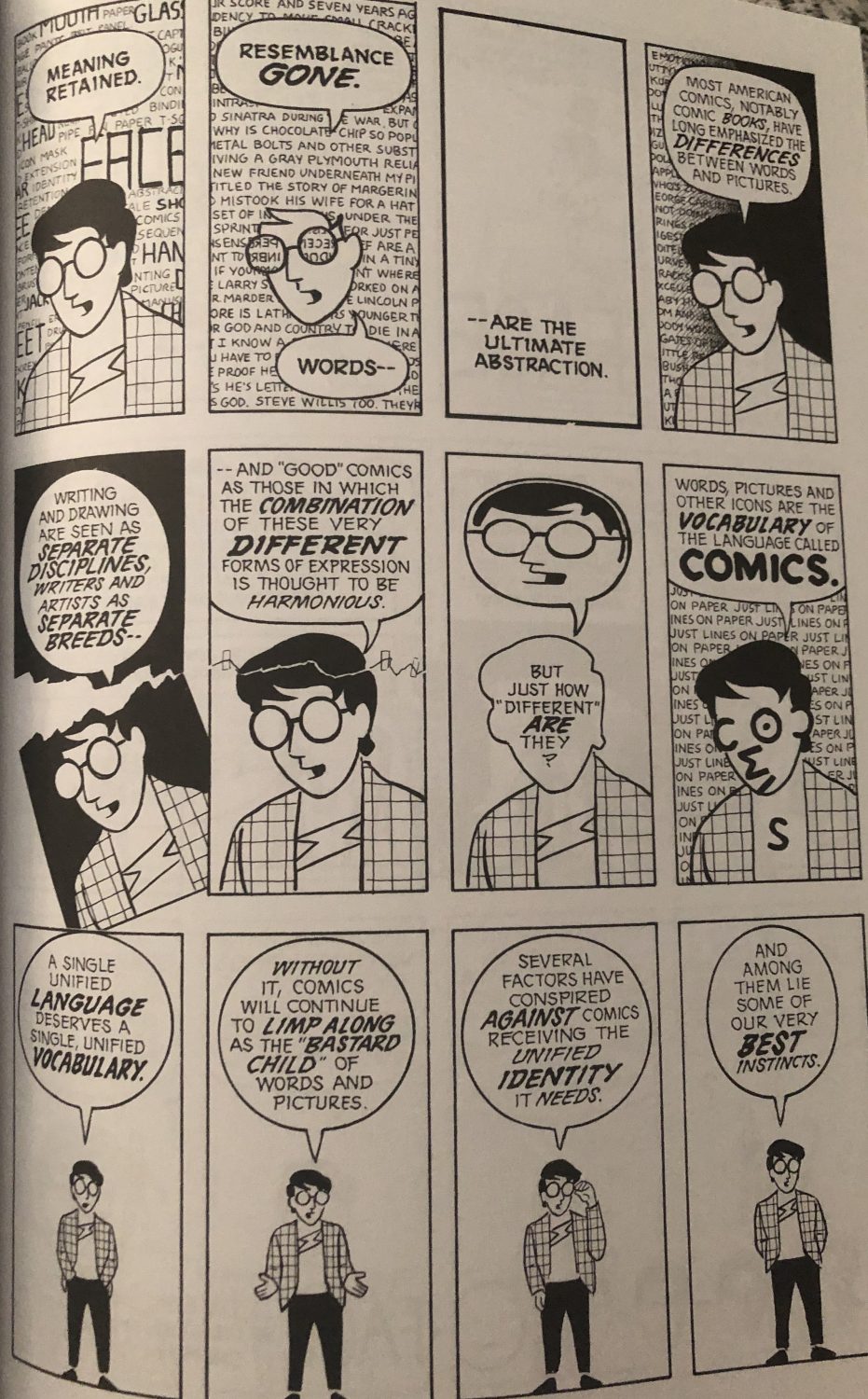 One principle that is effective on page 47 of “Understanding Comics” is the principle of repetition with variation. The top and middle panels are repetitive because Scott McCloud is in the same position in each panel only there are a few changes in each panel that add a degree of variation. The added variations, whether it be the added texts, the added shapes, or the different contrasts make it so that every panel is interesting in their own way even though they are somewhat similar. The bottom panels are also good examples of repetition with variation. Again, Scott McCloud is positioned in the same place for each panel but the variation comes from his hand positions in each of the panels.