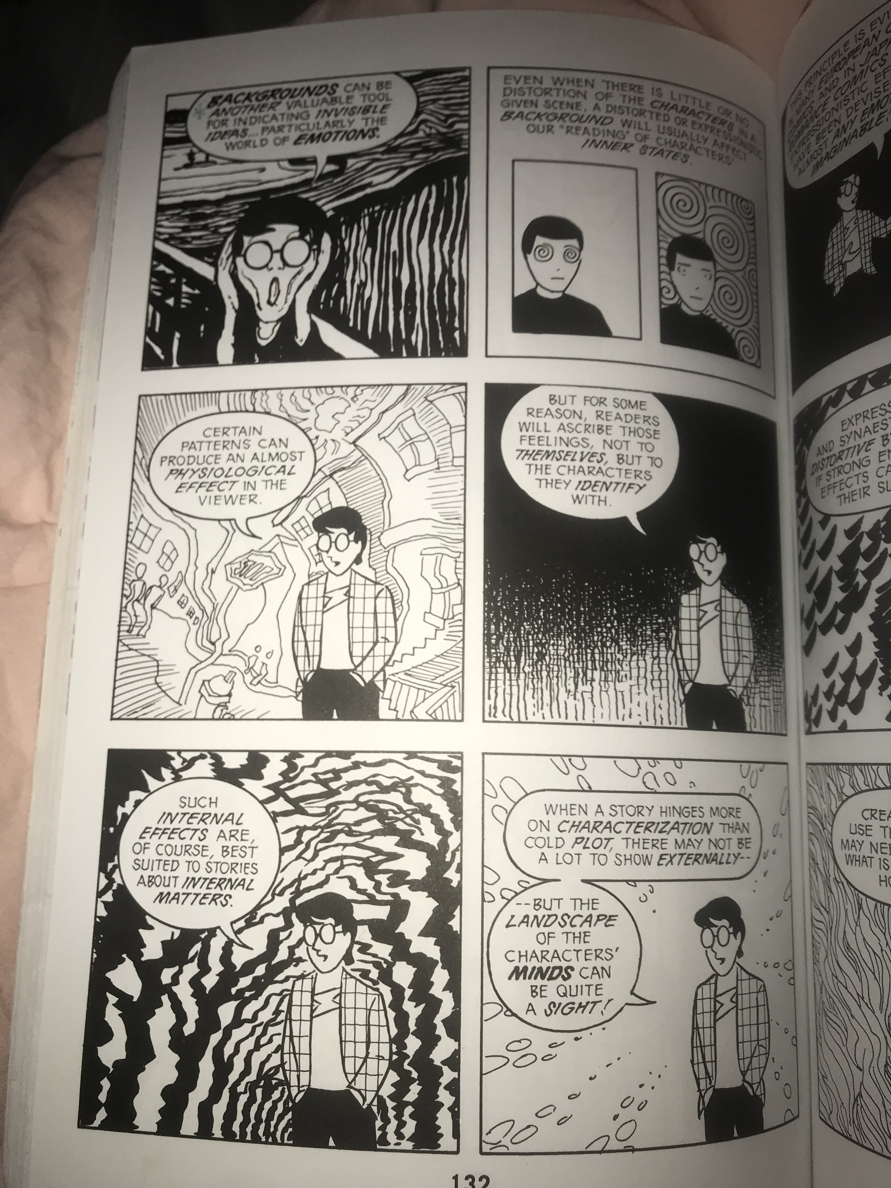 The use of line seems like one of the most “simple” elements to create as an artist, but it really sets the tone for the whole art piece. If it doesn’t flow just the right way it might throw the artwork off and make it harder for the viewer to comprehend. For example, on page 132 the second box down on the left , you can see how specific he meant to make the lines to look warped to the reader– a kinetic line. He used to the line to make it seem like the picture was moving or warping into something else, or in his textbook he describes it as a “psychological effect”.