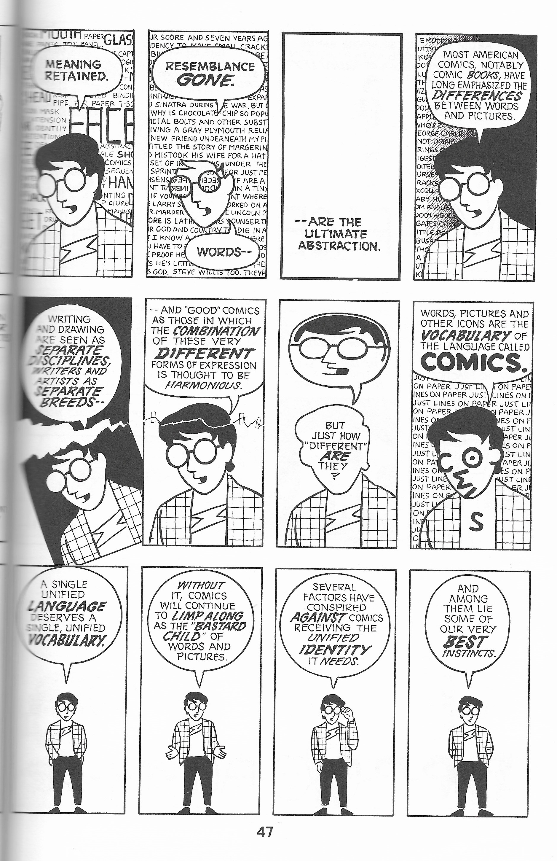 Throughout “Understanding Comics,” McCloud effectively implements the design elements and principles, each working in tandem to create an interesting layout while still being very informative. It is apparent that McCloud’s application of these elements and principles are practically present on every page within the book. One page that I would like to point towards is page 47.