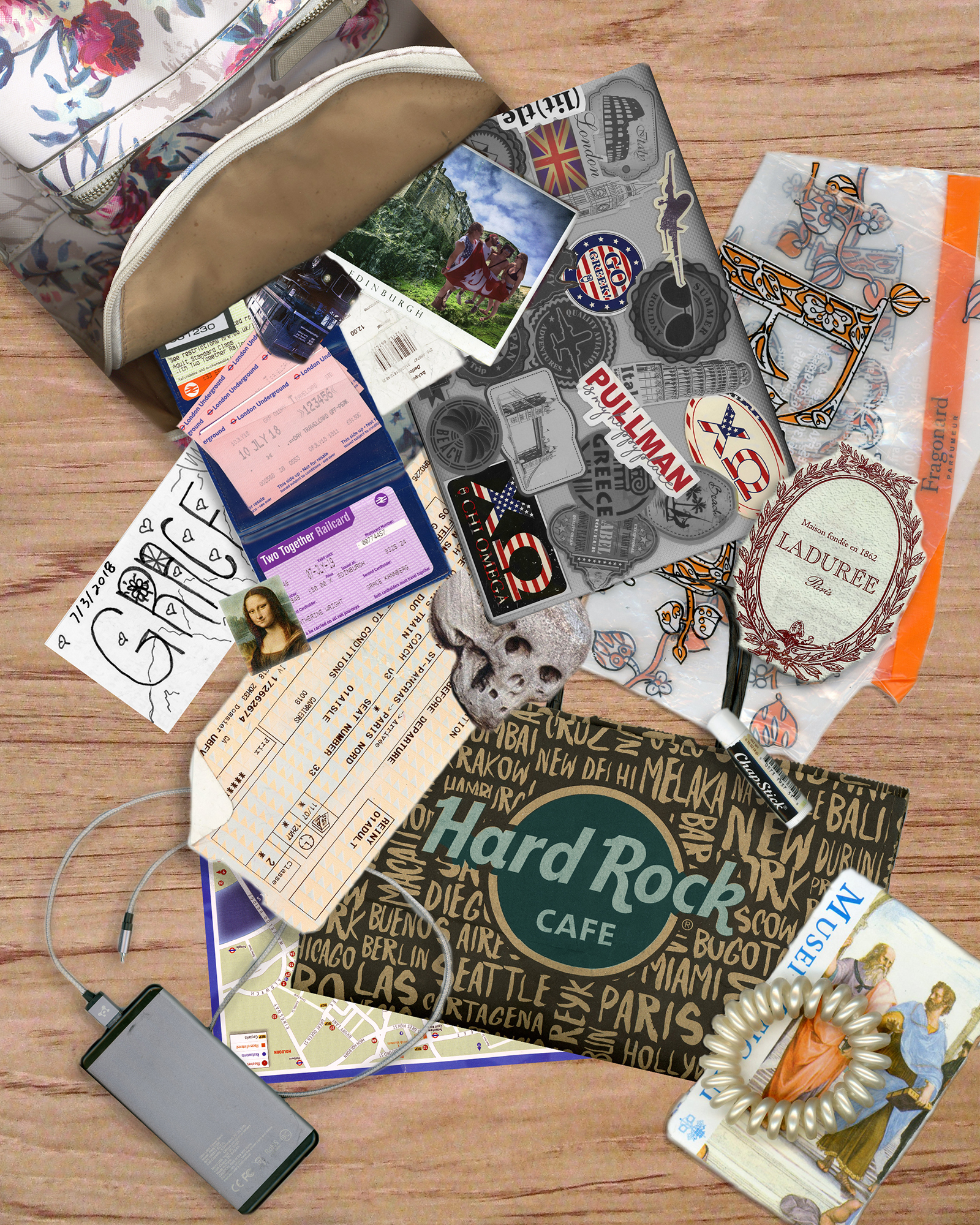My comic fits into MacCloud’s definition of comics by the way I have sequenced the items to look as if they were falling out of the bag. This imagery conveys the information that I have been traveling and what I have collected on my travels. I deliberate sequenced these imagines falling out of the bag by the order of the places I have gone. Starting with the postcard and Bus from Edinburg, Scotland and ending with the card I got in Greece.