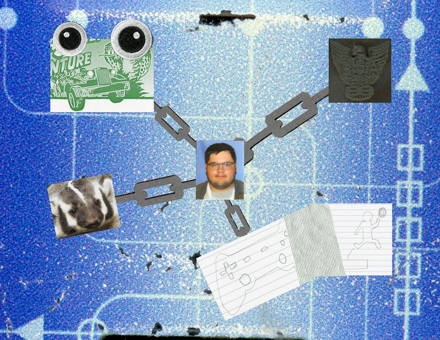 The next thing I connected to myself was an image of a badger that I got from a Northwest Trek ticket. This represents my love for animals and going to the zoo, though my favorite zoo to visit is Point Defiance. The final images that I connected to myself was a simple drawing of a game controller and a person doing some platforming, held together by duct-tape to represent my love for games that have a basis in platforming. The background of the collage is a small section taken from my phone case to represent my affinity for technology.