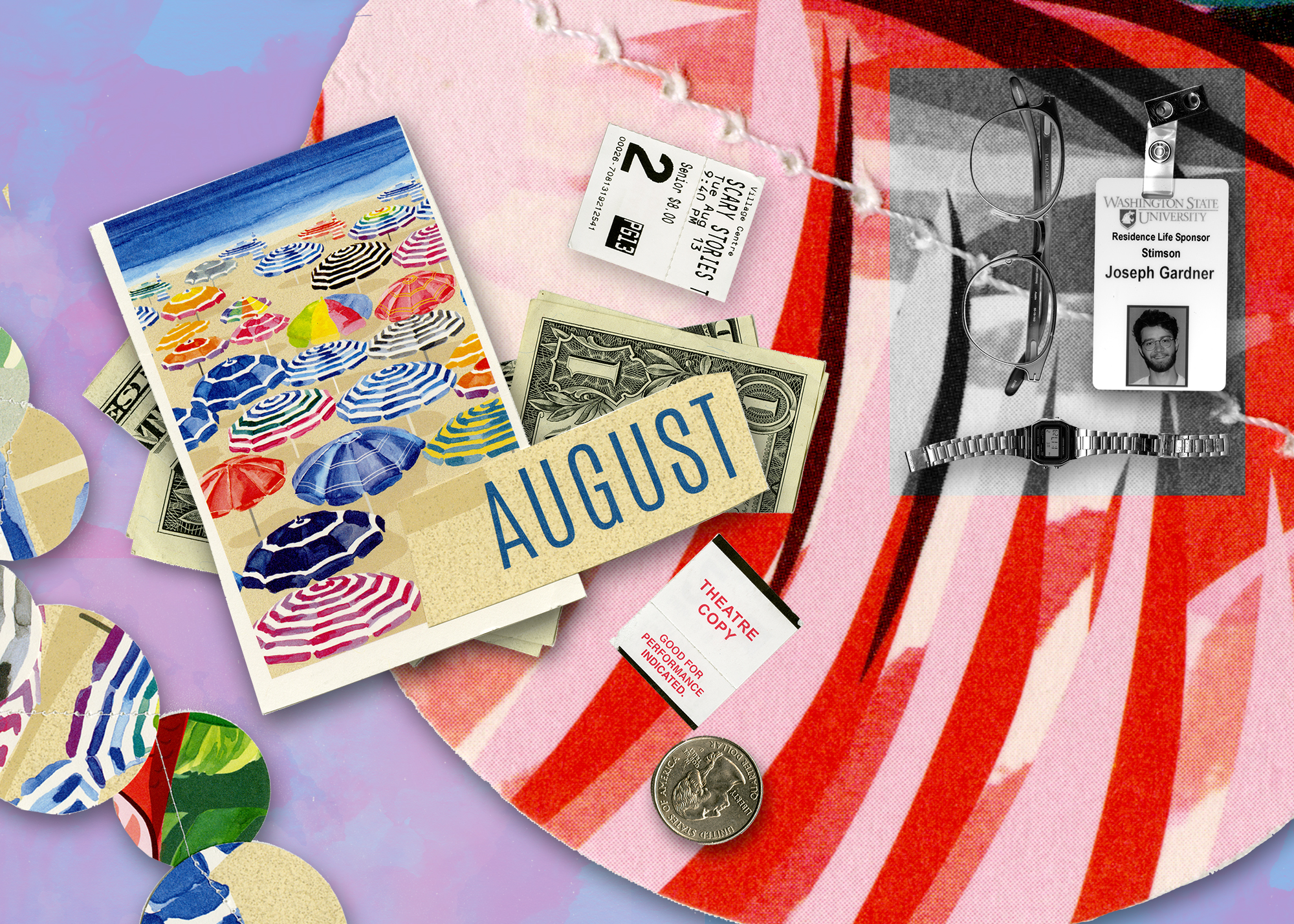 I chose the money, the movie tickets, and the images of the beach specifically for the summer section of the image. These are images that virtually everyone has interacted with and has positive experiences with. For the black and white school section, I used personal items to tell my story.