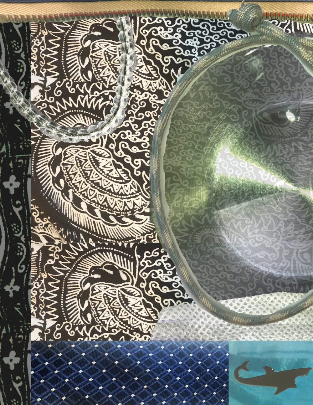 picture. The deliberate sequence was not in the order of the objects themselves but as in the layering of the collage. One image being pushed over the other another being cut out to show the background layer. I thought of it as a way to extend the meaning of a comic to a different level. I used John Lovett’s idea of texture when bringing in a metal can bottom to contrast the rope like bracelet I put on top of it. Also using Lovett’s theory of dominance, I made the bracelet and the shark the top layers, while rotating the borders in and out of being the dominant layer. The list of my objects are all items I wear, except for the metal can bottom; that was just an interesting touch and looked cool when faded out. I chose items with different feeling to them and tried to bring that idea to life when digitalizing the images. the bracelet on the left looks like just a bunch of small, plastic beads, while the bracelet on the right looks more rough and rope like. I do appreciate that when digitalizing these bracelets, that they do not just look flat and 2-dimensional, but instead they look like that one could just pick them up. I did not use any words because I cannot really put words to this collage, it really is just one of those photos where the meaning is put up for the viewer to create.