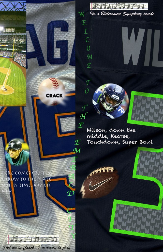 My creative influences for my collage come from my own personal experience as the two sides are a big part of my life. My family has Seahawks season tickets and big Mariners fans so I’ve been going to games since I was 6 months old sand the overall aesthetic goal was to try and show a big of those 2 worlds. The connection to McCloud with my collage is the difference but similarities between the two teams. Both sides of the collage show a jersey, player, song, and action as that’s how I associate them to me, they are both my teams but they are exact opposites of each other. They are contrasted as the Mariners side is more lightly colored while the Seahawks are a lot darker as well in terms of color. The textures of each jersey are very different as well and I’m pretty proud how well they separated because to me is looks really cool. I used shape and size to help both show off the jersey numbers and names of very popular players but allow the to still be seen easily. Each part of the collage has meaning from the songs both being the ones played before each game, and the quotes being of famous plays in the teams history are all real events that mean a lot to me as I’ve been there for all of them and I’m trying to convey that same sense of knowing by using them. In terms of the modes, for the linguistic mode besides the words meaning as i previously mentioned I tried to find font that seemed like spoken words as that’s what they really were, call by announcers. As in terms of my visual choices I tried to make everything seem as mirror image as possible to try and create a “2 sides of a coin” style of organization.