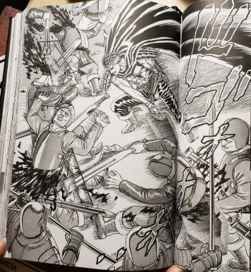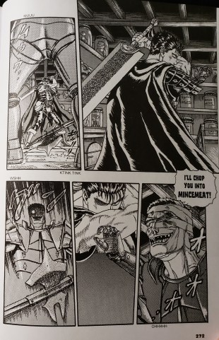 For an example of timescale I chose a giant multi-page panel from pages 394-395. In this scene, Guts the main character swings his comically large blade through multiple men. I picked this scene for its example of motion in a panel. Kentaro Miura uses the technique described in Understanding Comics of blurring objects in motion rather than motion lines. This scene shows one moment or one very short moment as shown by how the sword has already followed through the arc and is coming to the end of his swing. If you follow the trail of movement in this panel with your eyes you can see the trail of destruction it made from the men starting to fall apart and the lines of the men’s movement. This type of time frame of movement needed to be done in an extremely large panel to get the intended effect of the moment, forcing the reader to follow through with his eyes around the arc of the blade.