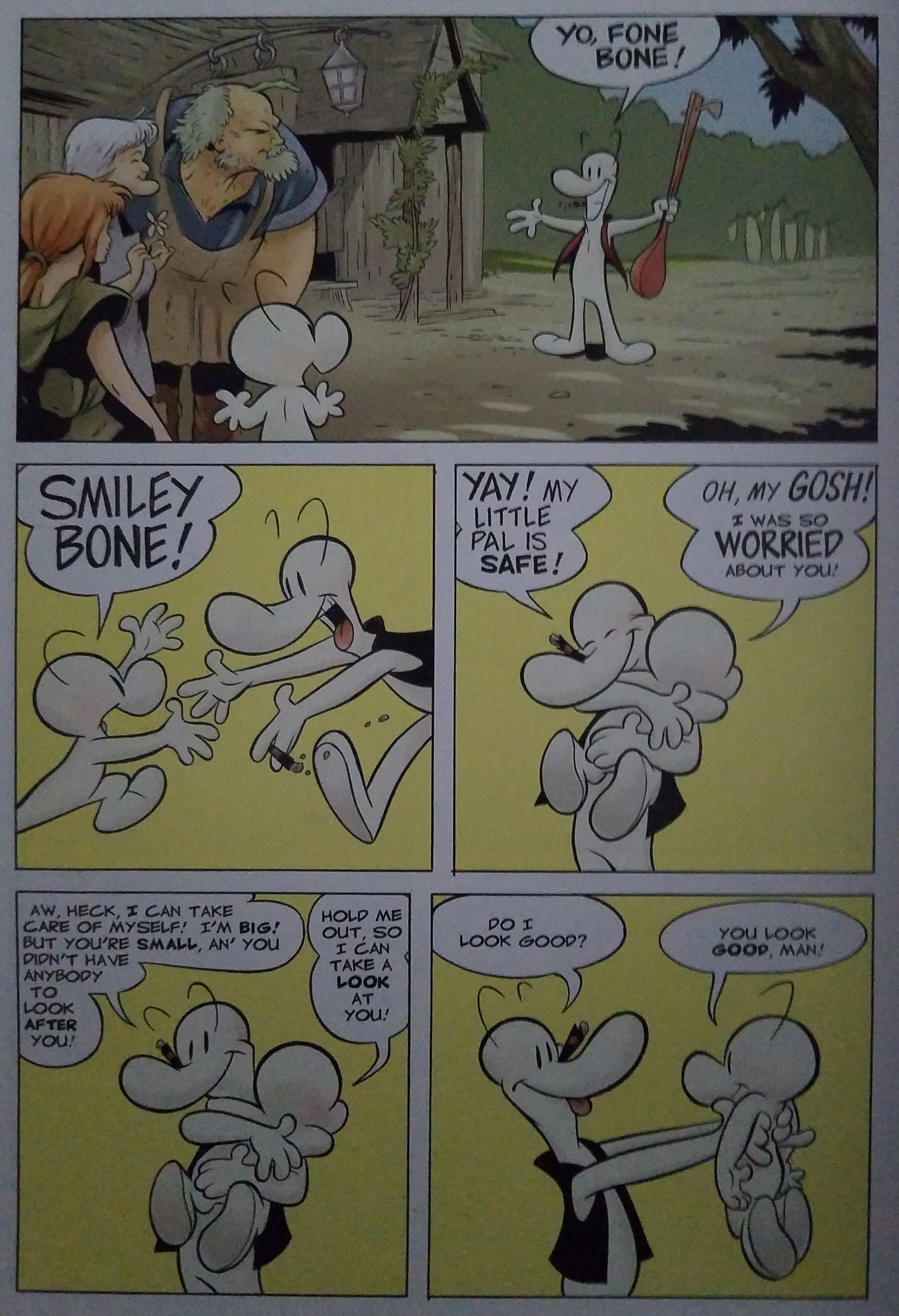 The book I chose to read is the first book in the Bone series, Out From Boneville. The example of closure that I chose is the scene where Fone Bone, the main character, reunites with his cousin Smiley Bone, which is one of his main goals throughout the book. This scene is both an example of moment-to-moment, and action-to-action. It is moment-to-moment when the scene goes from Fone and Smiley see each other to them running to hug each other. Another neat detail is how the background goes from the detailed forest to a single color to denote that their reunion was all that mattered in that moment. The page then goes to an action-to-action format when they talk to each other. Going from a hug to Smiley holding Fone out so he can get a better look at his cousin.
