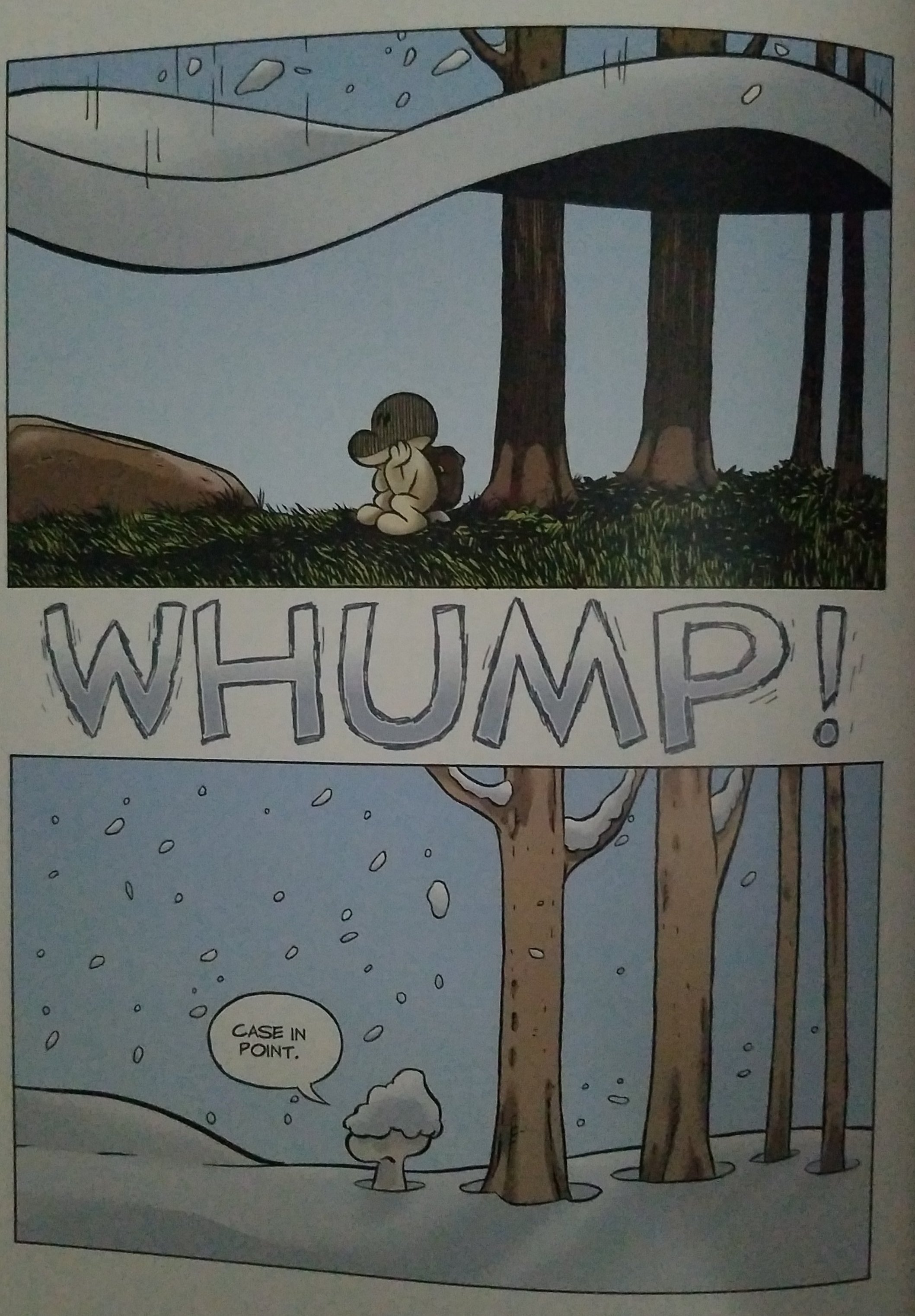 The example I chose for the time frame, is the part of the book where winter arrives. Earlier in the story, Fone Bone is warned by Ted, a leaf-shaped bug, about winter in the Valley, which hits “fast n’ hard in these parts.” Fone Bone sits to ponder what he should do next when winter hits. This scene, while telling the readers what exactly happened before and after, leaves it up to our interpretation exactly how hard the snow fell. For all we know, the ground could have quaked a bit because of the WHUMP! onomatopoeia. Fone Bone could have been completely buried before poking back up out of the snow. That’s not even counting what happened off-screen, as this snow falls all over the valley like this.