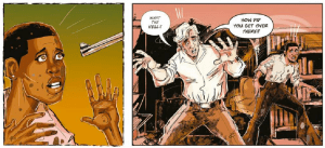 I chose to read Octavia E. Butler’s Kindred, a graphic novel that focuses on a woman of color who frequently travels back in time to the deep south during the time of slavery. This first scene is one of the first times that the main character time travels, an example of scene-to-scene closure, as the subject stays the same but the scene changes. The main character comes from a scene in which she is going to be shot for being around a white, slave owner’s son. In the present, the colors are muted to tones of browns and tans, while the past is generally colorful and more “intense.” This is a form of scene-too-scene closure, as the reader must interpret what happened between the two scenes, particularly what the main character experiences/sees while time traveling. Through skimming the pages, there is no real visual interpretation of what time travel looks like, meaning the reader must fill in the gap and decide what exactly it looks like based off our own experiences/views of it (for instance, how Dr. Who depicts it versus how Marvel’s Endgame depicts it).