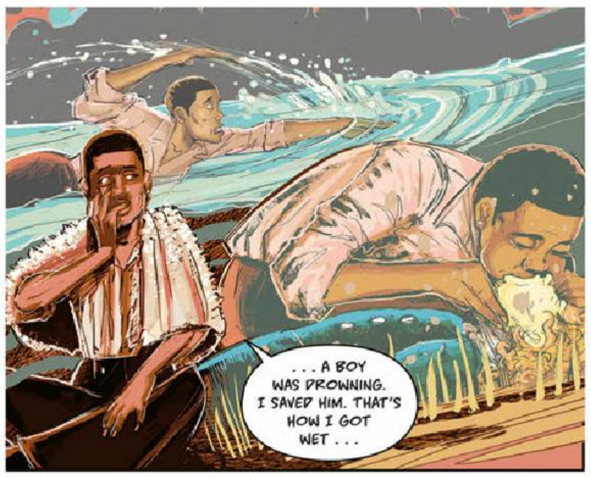 This scene is an example of a time frame. It is one panel, however, it takes up a large portion of the page. This scene depicts the time passing from the main character jumping into a lake, to doing CPR, to then thinking on it after she has already been transported back to the present. This is a good example of a time frame, as there is obvious time passing even though the main character is depicted three times in the scene. The reader must realize that these are three different scenes even though they’re superimposed on top of one another.