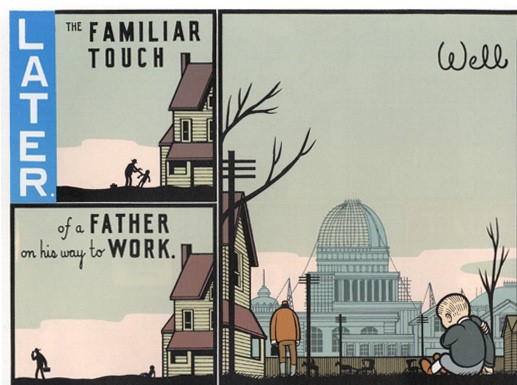 Since my first project focused more on the mainstream side of comics, I wanted to dive into some deeper subject matter for this project. For that reason, I decided that I want to read Chris Ware’s Jimmy Corrigan: The Smartest Kid on Earth. Listed on NPR’s “100 Best Comics and Graphic Novels,” Jimmy Corrigan is described in a way that I thought made it perfect for this project. NPR says that Chris Ware has “master[ed] the comics medium’s unique ability to create tension between words and images,” which to me sounds like Ware must be proficient in how he manipulates how much the viewer is required to participate in the story through the use of closure and time frames. I also read that this graphic novel is not only a masterpiece, but that it feels “like a series of gut punches,” (NPR). As I began to skim this graphic novel, I immediately felt the sense of sadness from the main character from everything about him including his apartment are bland, unexciting colors along with sad imagery of what his dad walking away from him. It, too, was immediately evident how great of a graphic novelist Chris Ware is.