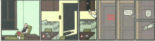 One example of how Chris Ware uses closure is in this fairly simple sequence of panels. Ware shows Jimmy sitting on his chair in a room, doing nothing, which provides a sense of boredom from this character. Then in the next panel, the reader sees a shadow of man standing in the doorway outside of a kitchen. According to Scott McCloud, what has happened in between these panels is entirely up to the viewer. As a viewer, I pictured Jimmy standing up from his chair to walk into his kitchen. This is an example of subject-to-subject transition as it follows Jimmy through his home. As the viewer reads along, Jimmy is not shown in his entirety in the panel, but the viewer feels that he is there. I think what the viewer feels from two panels has a big effect on how they interpret what occurs in the gutters between the panels.