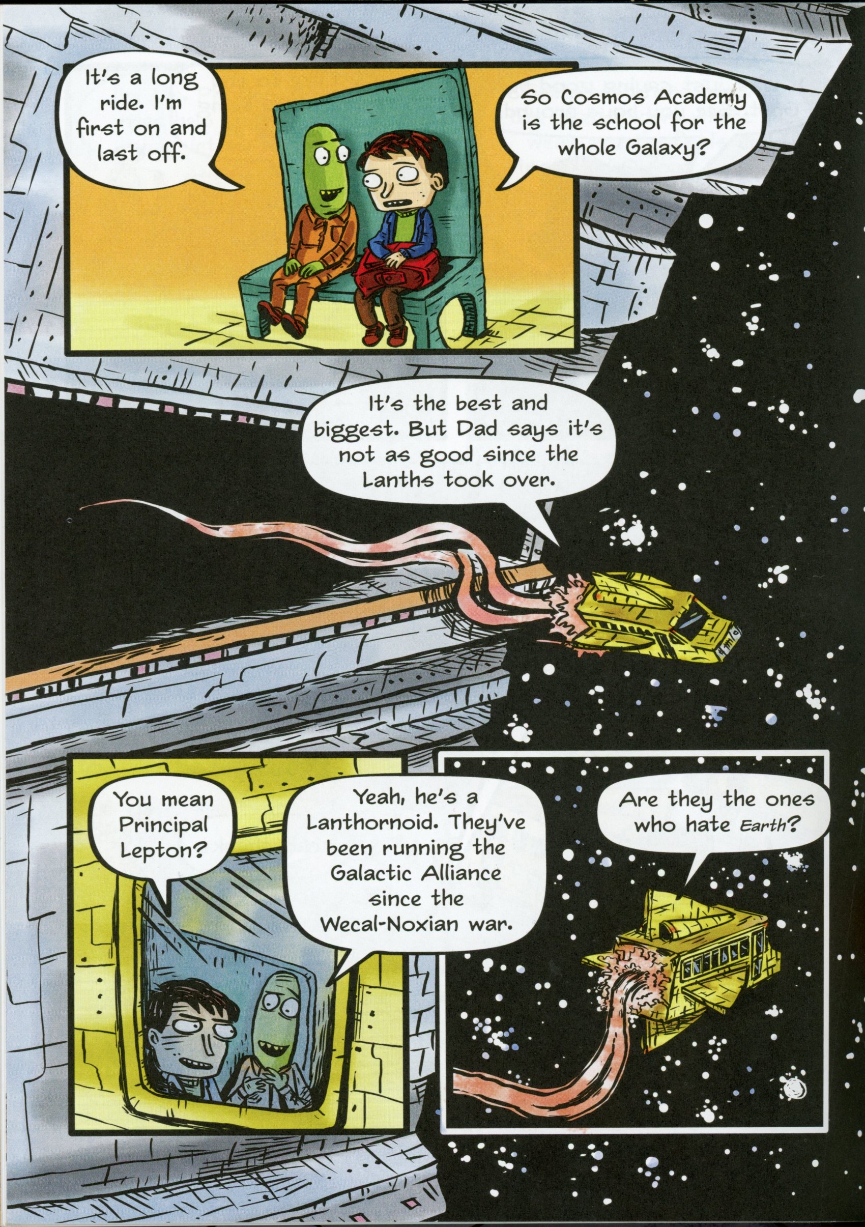 Page 58 has 3 panels over a big background. The first panel shows the boy sitting down and talking to an alien. The image is very still and the frame is pretty wide showing time passage. It appears that their conversation lasts at least a few minutes. The sequence then moves toward the boy and the alien looking out the window to a far away view of the spaceship school bus flying through space. This sequence does a good job of letting the viewer know that a lot of time is passing.